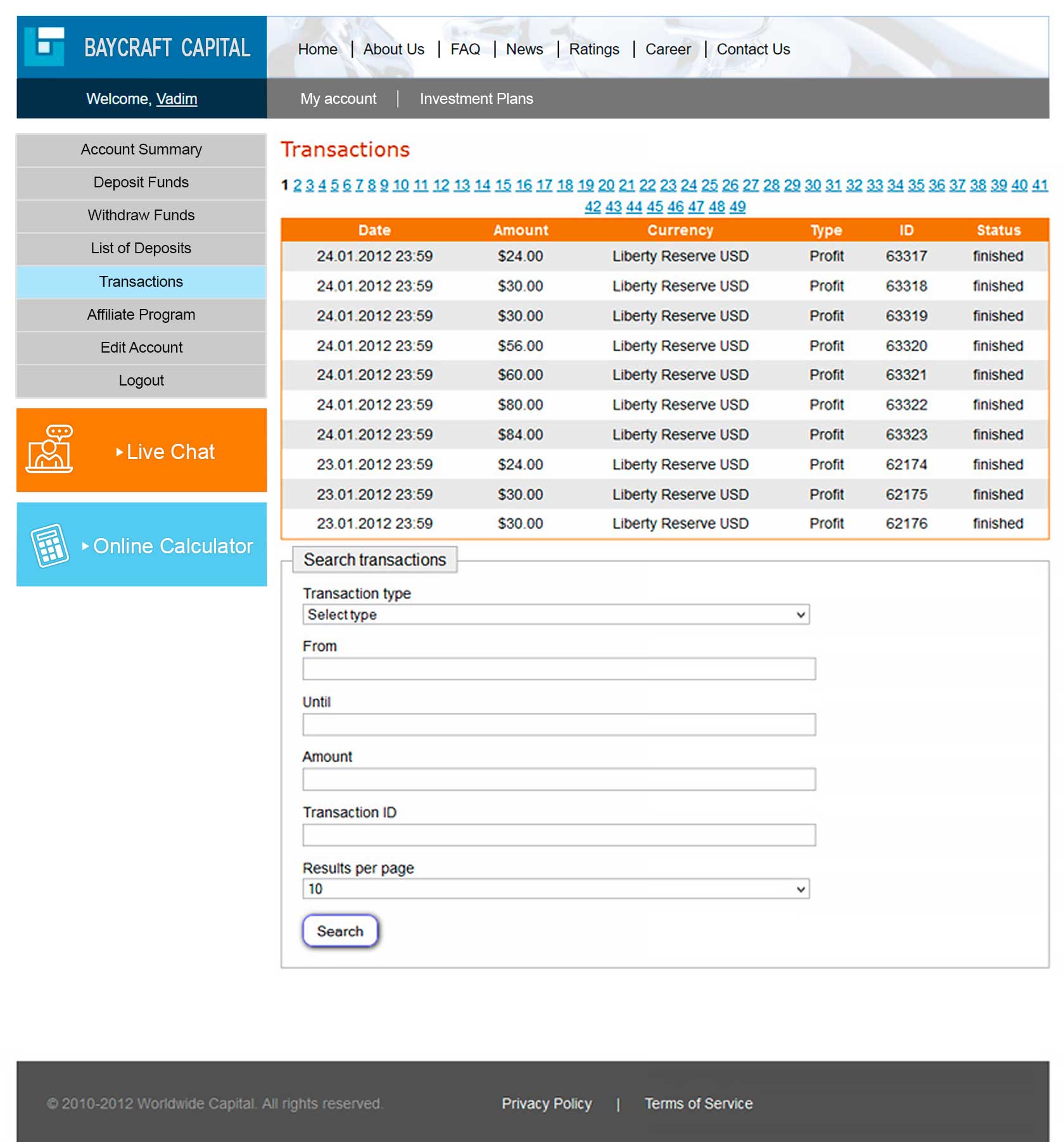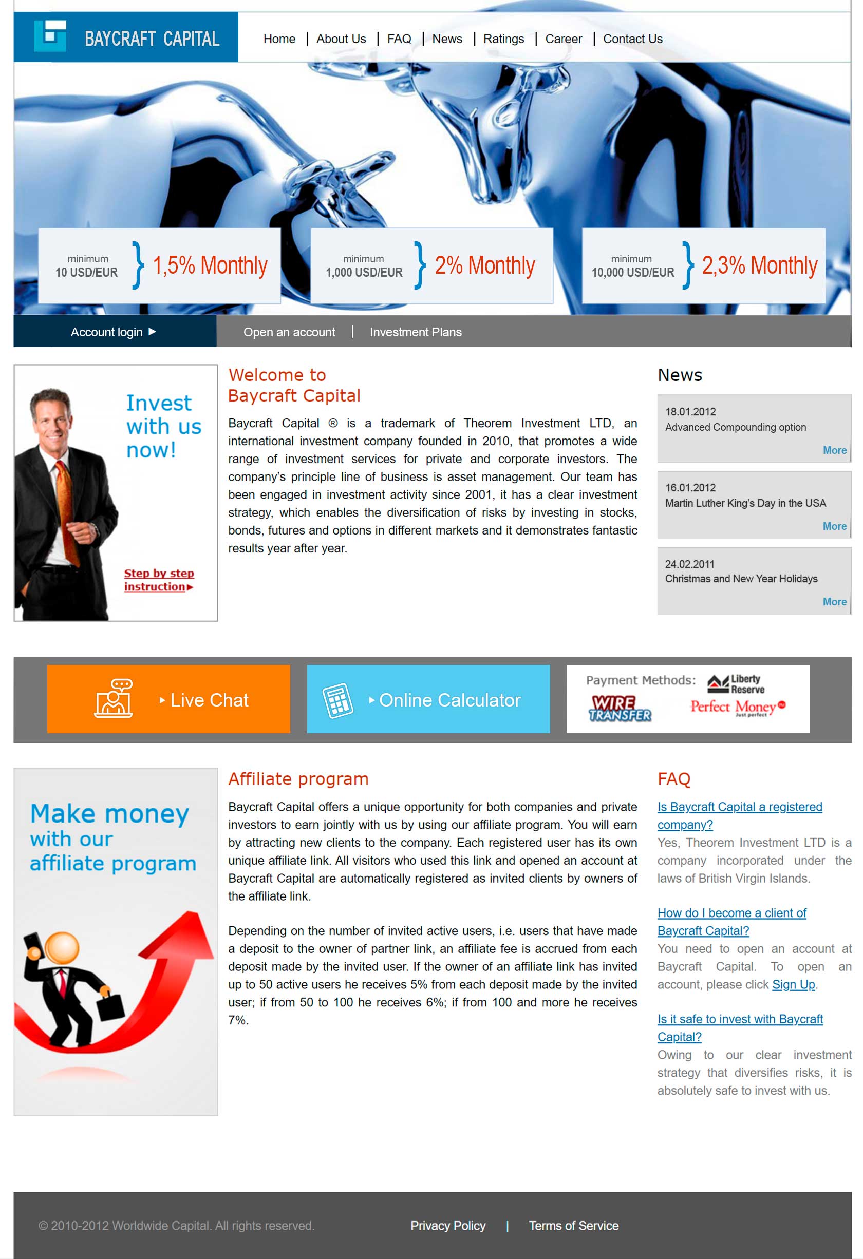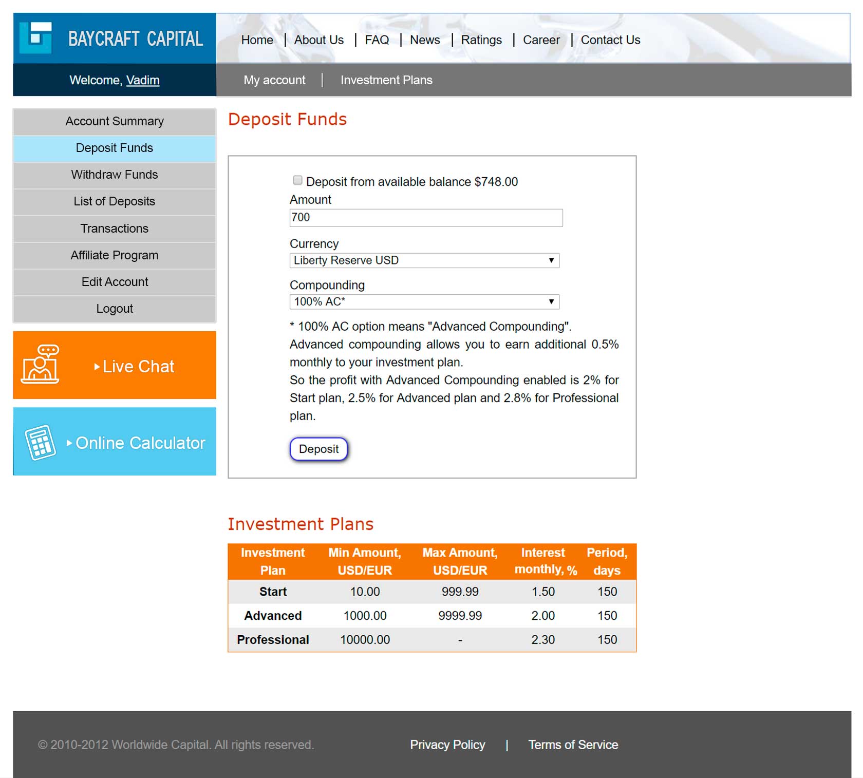 Сайт инвестиционного проекта. Реализованы личные кошельки пользователей, ввод-вывод средств, перевод между личными счетами, начисление процентов в рамках партнерской программы. Множество платежных систем, развитая система бонусов. Проект "под ключ", особое внимание уделено безопасности.