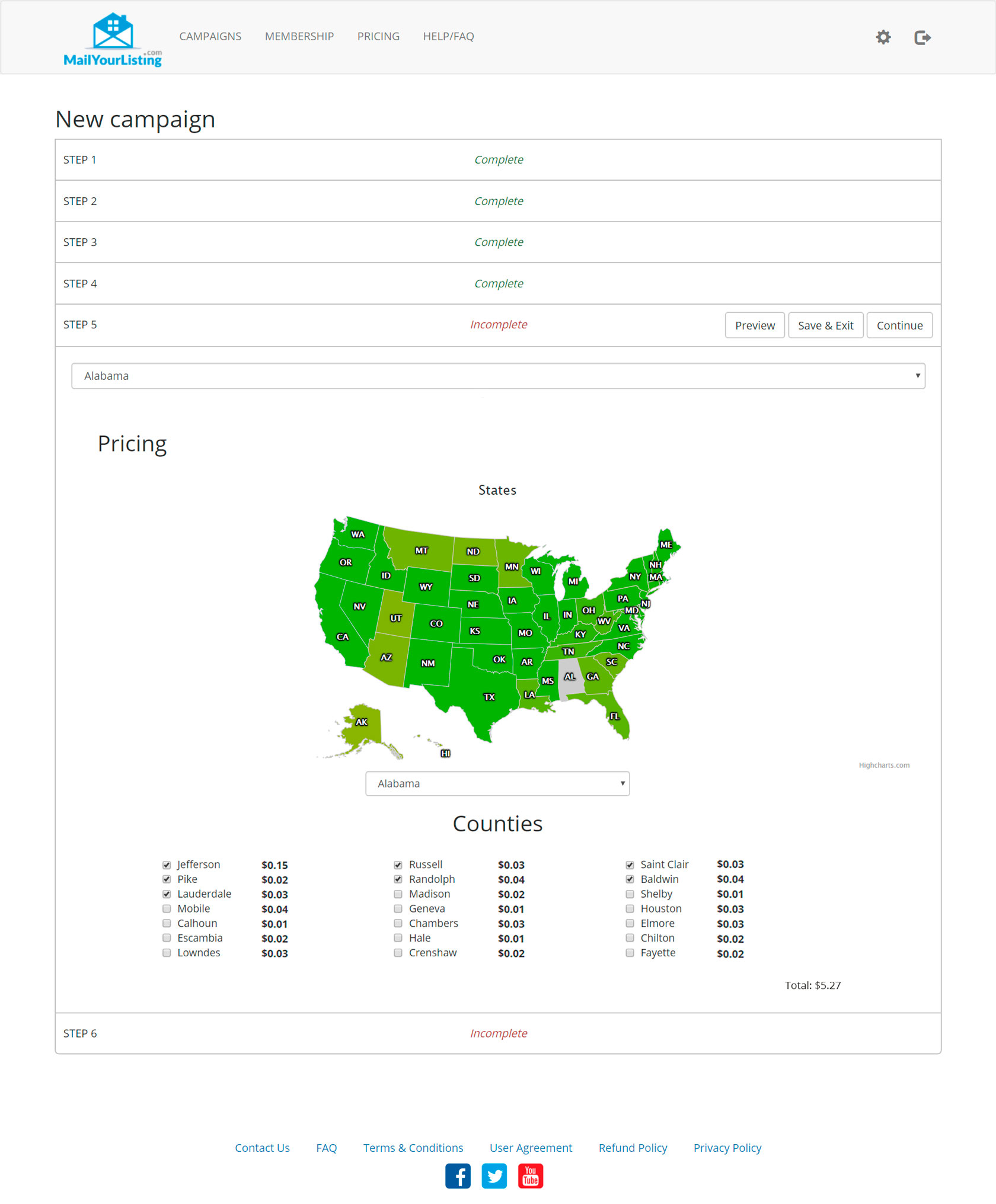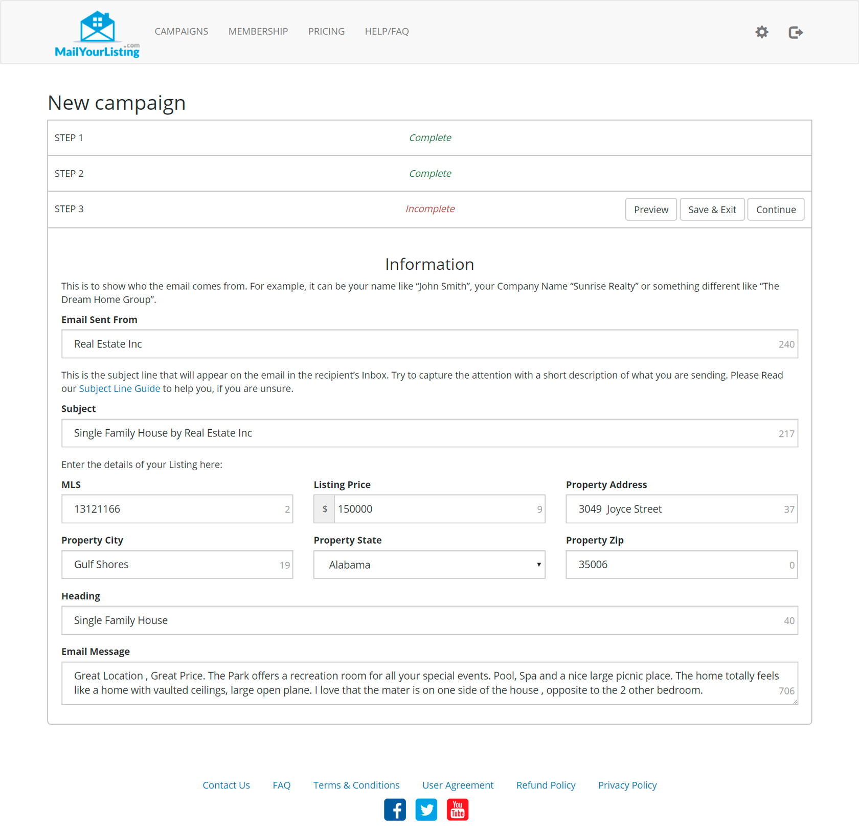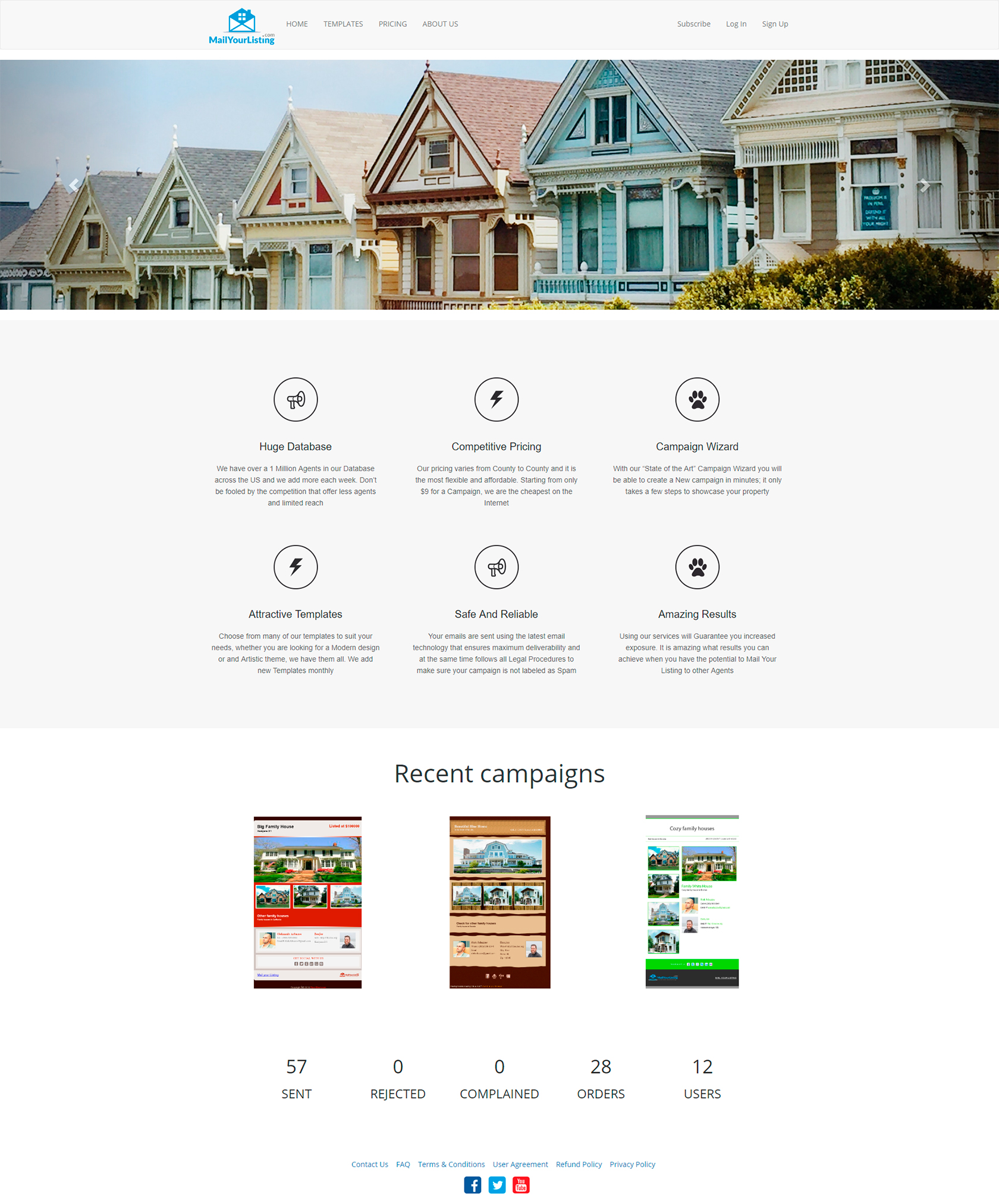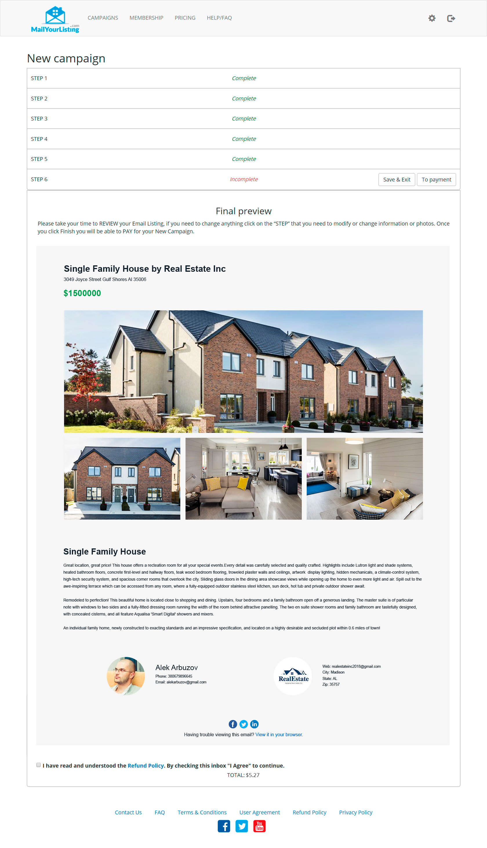 Интернет-платформа по продаже недвижимости. Она позволяет делать платные рассылки по закрытой базе сертифицированных риэлторов. Пользователи выбирают шаблон письма, указывают тип объекта, контактные данные, фотографии. Цена формируется автоматически в зависимости от количества риэлторов в выбранном регионе США. Есть платная подписка, она дает скидку на рассылки и увеличивает скорость отправки (6 часов, вместо 24 без подписки).