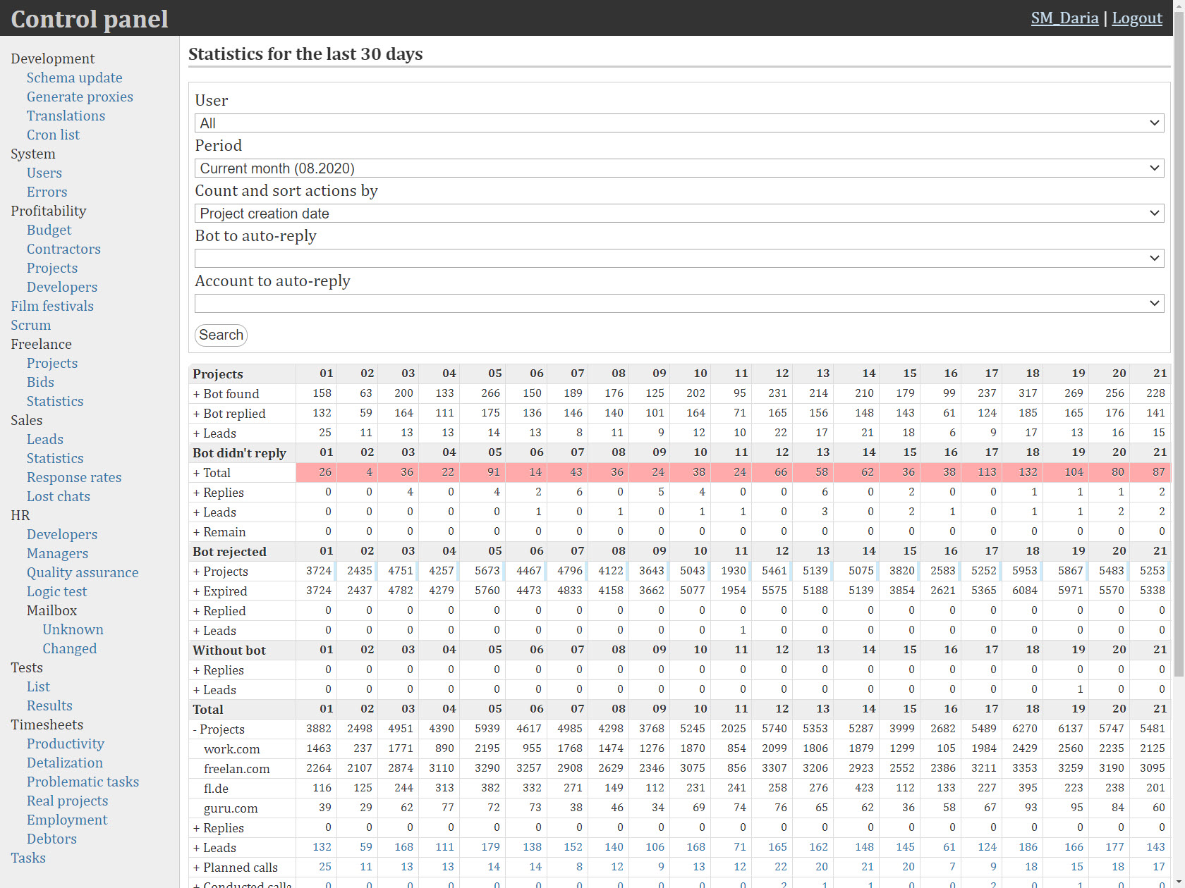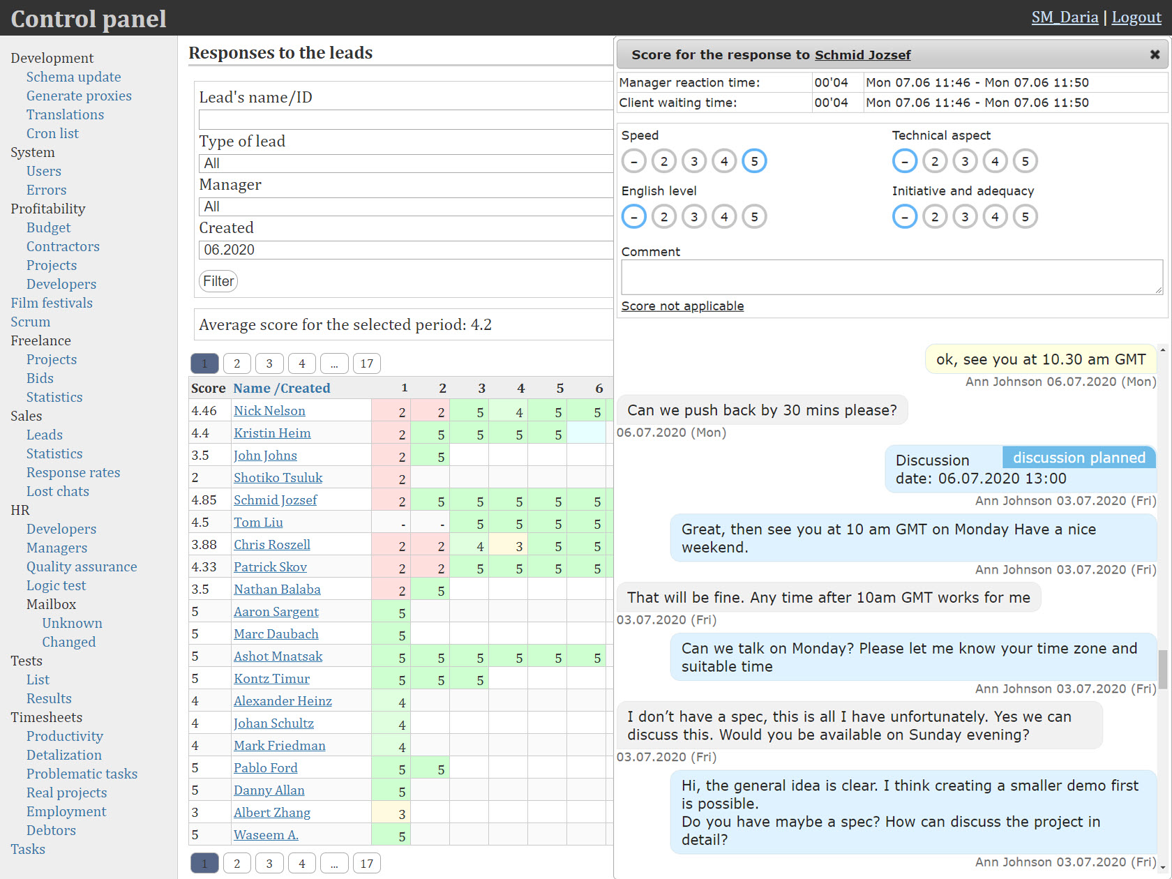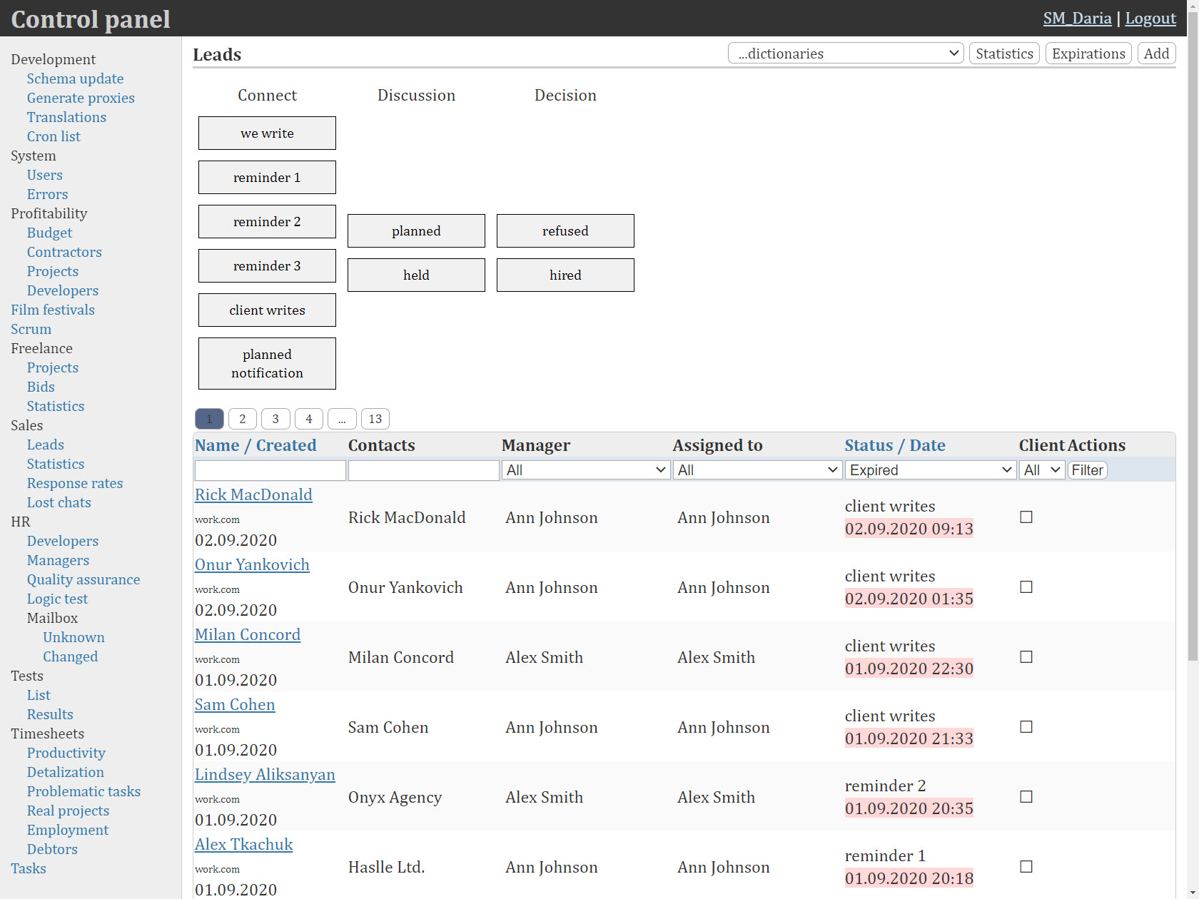 Есть возможность смотреть статистику по этапам воронки. Например, система может показывать, сколько лидов было получено, сколько из них стали клиентами, или на каком этапе был получен отказ. Руководство может оценивать сообщения персонала (скорость, инициативность и т.д.), что позволяет привязывать мотивацию к достижению определенных показателей.
