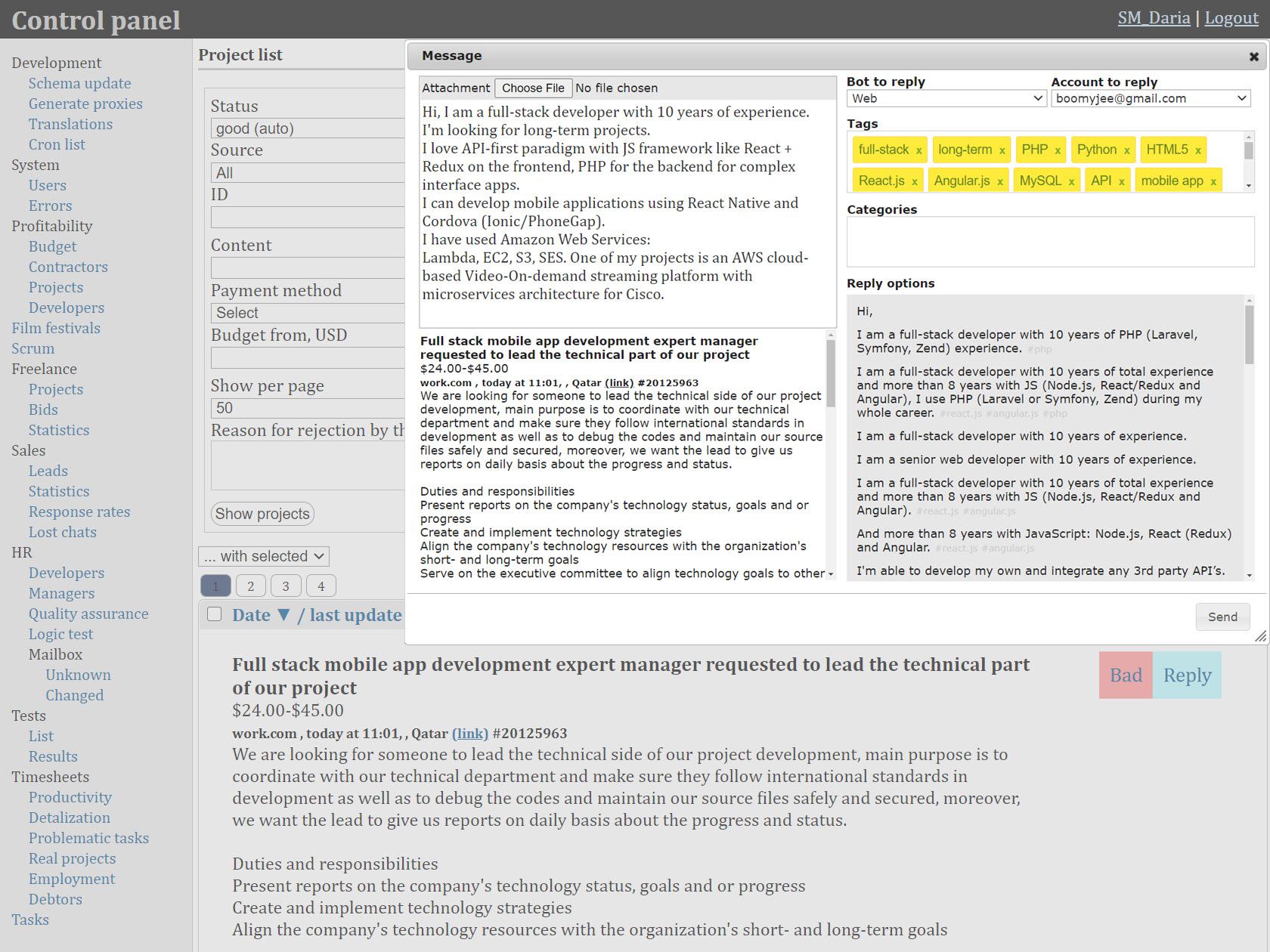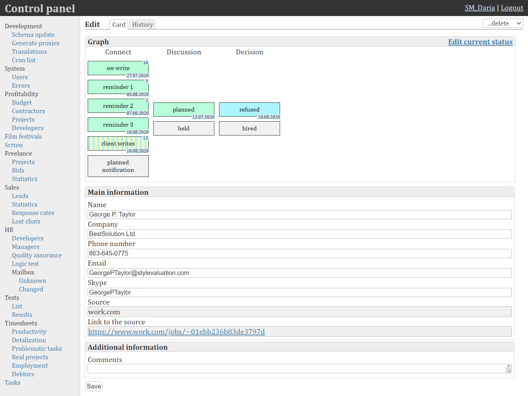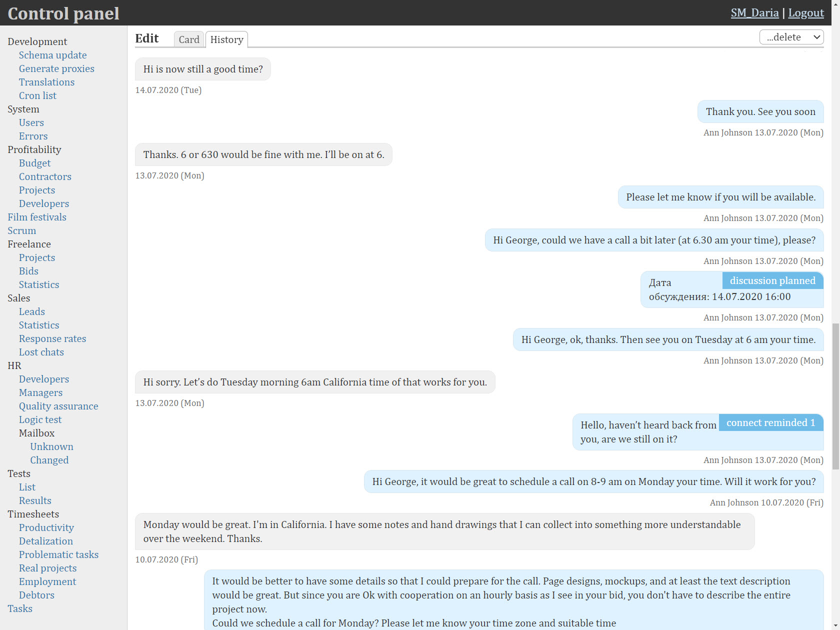 CRM система для автоматизации полного цикла продаж. Система синхронизируется с Skype/Slack/Telegram/почтой и фиксирует всю историю взаимоотношений с клиентами. При этом, лид может даже не подозревать, что общение с ним ведется не напрямую через мессенджеры, а через CRM систему. Приложение напоминает о необходимых действиях, таких как отправка напоминаний лидам, запланированных звонках и т.д. Напоминания отправляются через мессенджеры/электронную почту. Таким образом, ни один лид не будет оставлен без ответа.