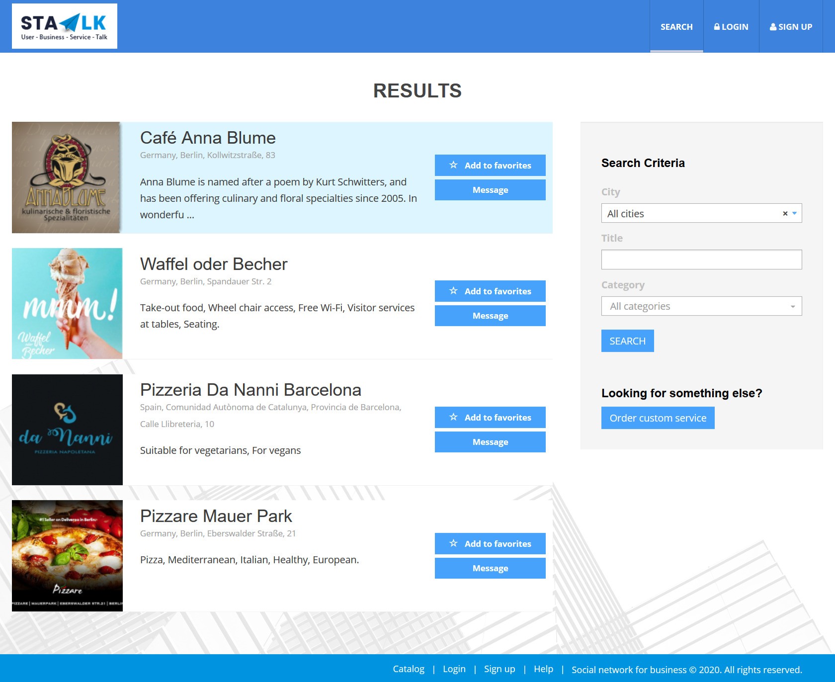 Кроме активного поиска - возможности найти заведение по названию или категории, сайт позволяет создать заявку на услугу или товар. Заявки приходят владельцам заведений и позволяют им отправить пользователю личное предложение.