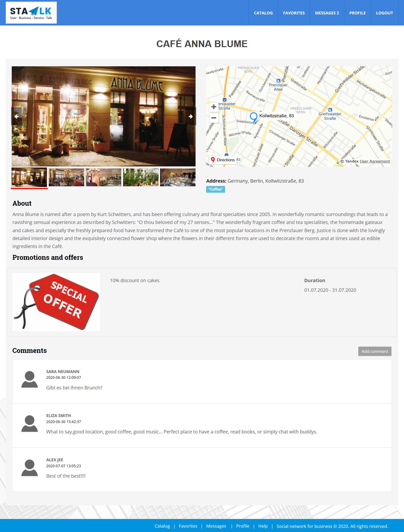 Социальная сеть для бизнеса. Место, где клиенты могут найти профиль заведения, узнать о последних акциях, почитать комментарии и связаться напрямую с его владельцами.